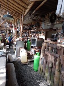 3. El espacio: Estrecho, mesas irregulares los platos (de metal) bailan sobre las tablas, las bancas inestables y angostas. El decorado bonitas las plantas, especialmente los helechos, pero la atiborrada decoración de elementos viejos que quieren asemejar a antigüedades dejan una mala impresión en un restaurante por que se observan sucios y cubiertos de polvo. Los baños insuficientes y en deficiente estado.