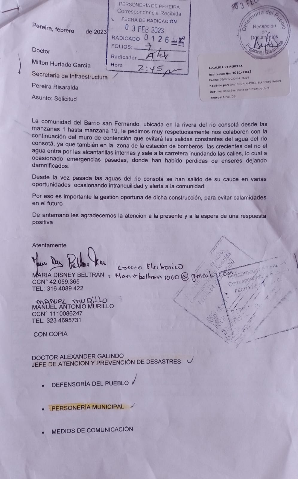 La comunidad del sector La Playa del Barrio San Fernando ha hecho una solicitud a la administración local, respaldada por casi doscientas firmas de habitantes de la zona, en la cual exigen la continuación de un muro de contención en la rivera del rio Consotá debido a las continuas inundaciones causadas por el desbordamiento del afluente, con los perjuicios y riesgo para la comunidad que habita este sector. Se espera que el jefe de atención y prevención de desastres Alexander Galindo, el secretario de infraestructura Milton Hurtado y el alcalde Carlos Maya entiendan la problemática de este sector y atiendan las peticiones de la comunidad con la implementación de una solución definitiva. Hasta ahora, la administración ha ignorado las peticiones y dilatado la solución definitiva a este problema. Carta con copia a la Defensoría del Pueblo, Personería Municipal y medios de comunicación.