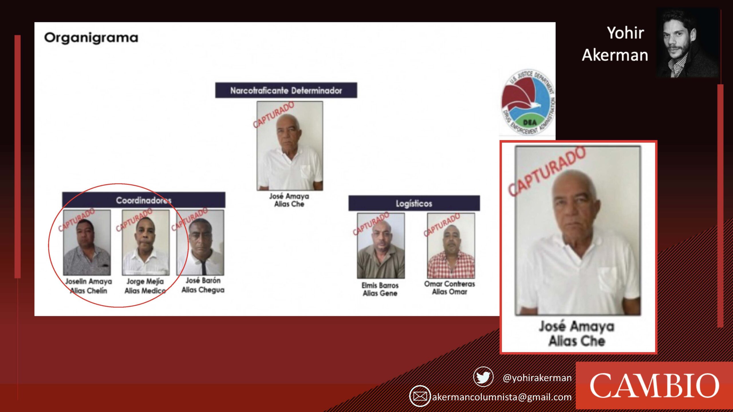 Por la posición geográfica de Dibulla, el Che se convirtió en una conexión clave de los carteles de la droga desde la legalidad. Terminó siendo determinador de grandes proyectos, como el puerto de aguas profundas denominado Puerto Brisa, gracias a una sociedad de la tierra donde se ubicó el megaproyecto, que fue diligentemente patinado por el hermano del expresidente Iván Duque. Che Amaya es el padre del alcalde de Dibulla, Marlon Amaya Mejía. Pongan cuidado porque el árbol genealógico y criminal se va poniendo más complicado. Alias Che no solo tuvo hijos políticos. En la misma redada liderada por la DEA fue capturado el otro hijo de Che, hermano del alcalde, el señor Joselín Amaya Mejía, alias Chelín. Este es señalado de coordinar reuniones para el transporte de la cocaína hacia la Alta Guajira, desde donde sale con destino a las islas del Caribe y Centroamérica. Nada mejor que tener un hermano alcalde, líder de la policía local, para coordinar la entrada y salida de los barcos con estupefacientes.