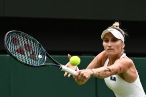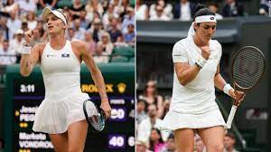 ______  Wimbledon. La checa Marketa Vondrousova derrotó por 6-4 y 6-4 a la tunecina Ons Jabeur este sábado en la final de singles femenino disputada en el All England y se consagró campeona de Wimbledon, el primer Grand Slam que consigue en su carrera.